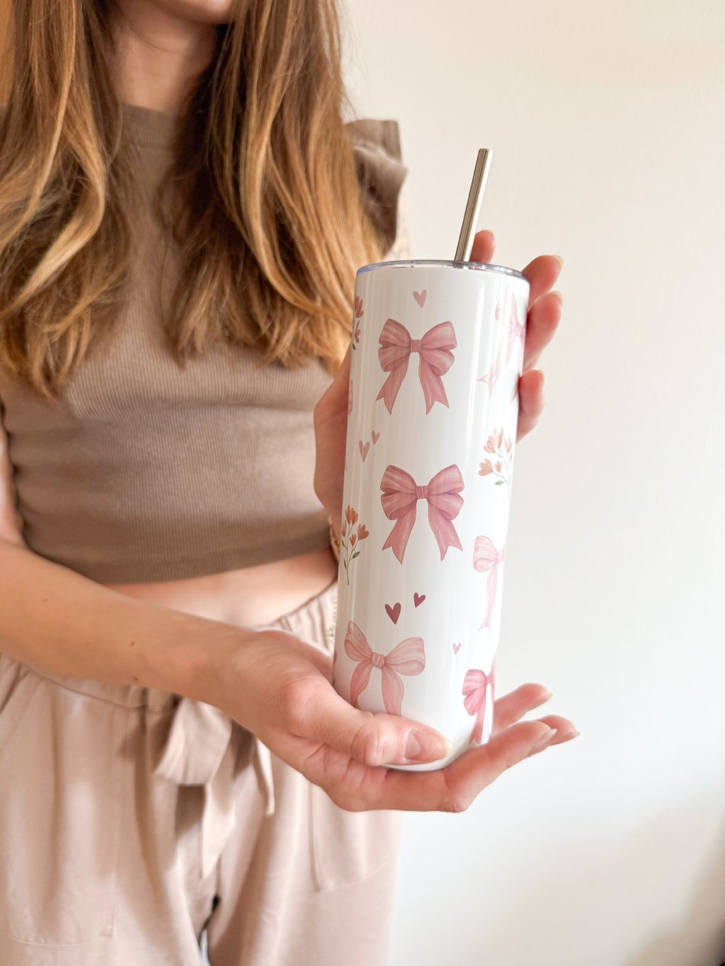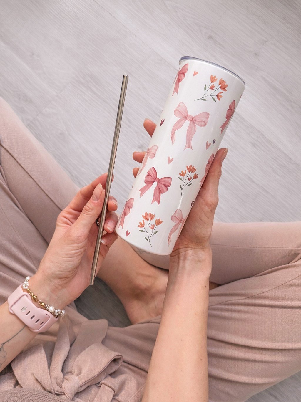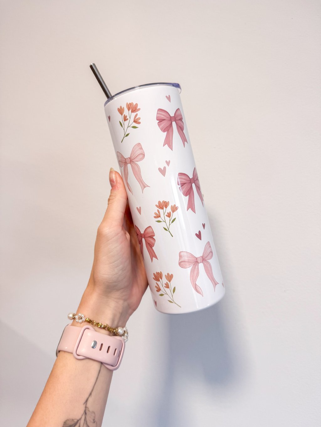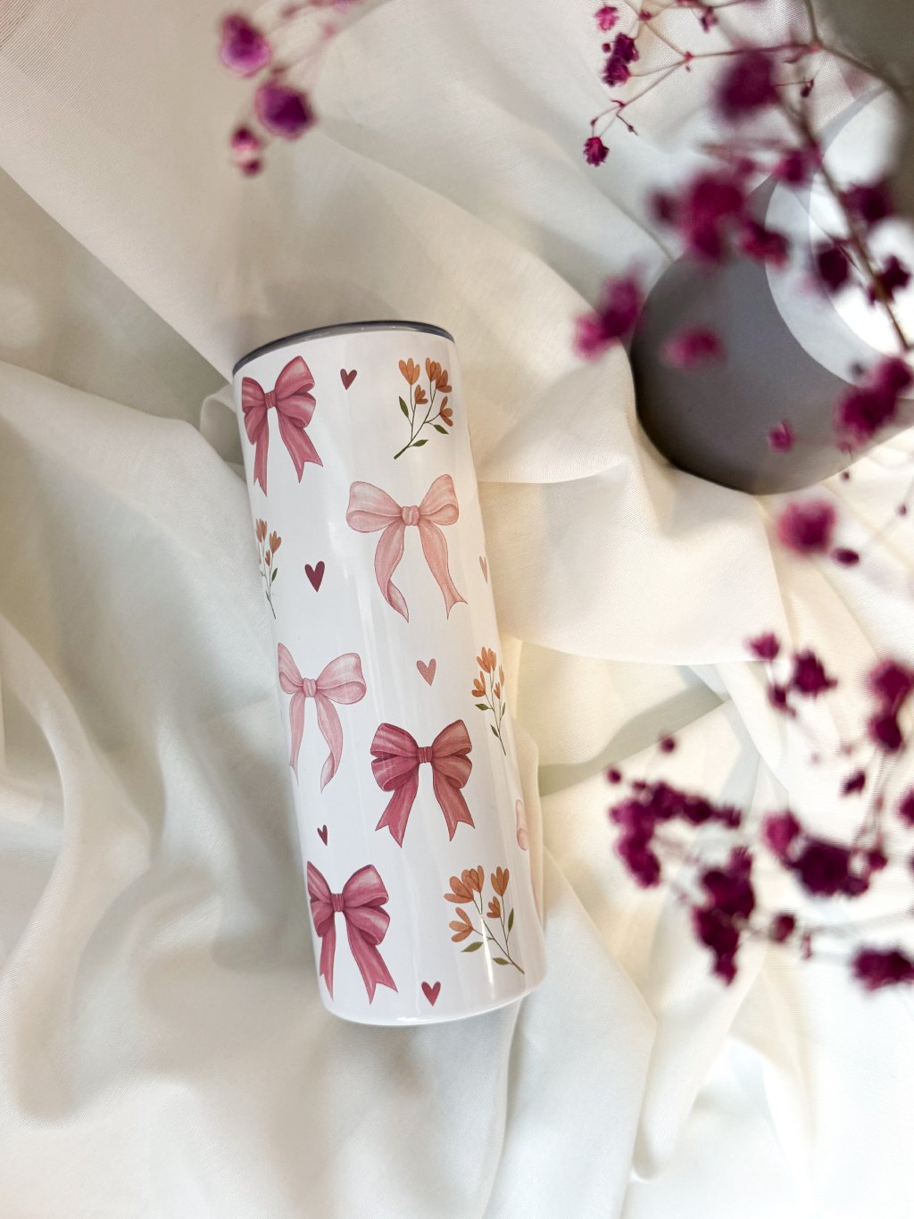 Tento nerezový termo kelímek s autorskou ilustrací mašliček a dalších růžových maličkostí je důkazem, že i obyčejný doušek kávy nebo čaje může být malým rituálem. Design jsme tvořili my – od prvního nápadu až po finální potisk – s láskou k detailu a radostí z tvoření.